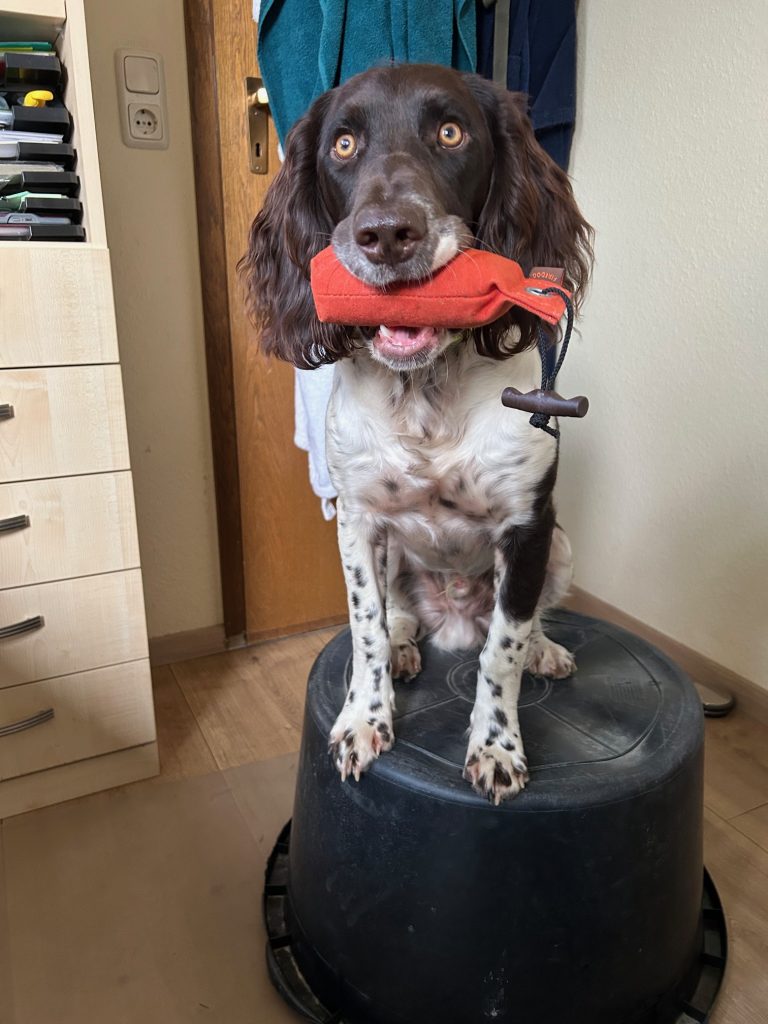 Alleine das Klettern auf diesen Eimer – entwürdigend! Und dann noch das Apportel halten müssen! Doofe Übung. Ich hab das Ding auch nur gerade lange genug festgehalten, um dieses Bild zu machen. Ich hoffe, dass Frauchen mich zukünftig mit diesem Sch…. in Ruhe lässt.